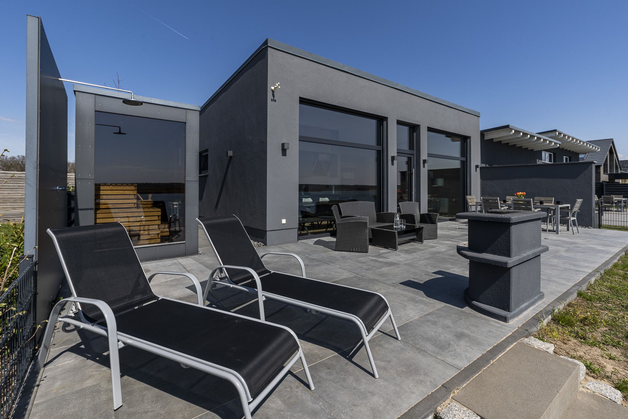Sauna, Außendusche, Holzkohlegrill, Loungemöbel, Esstisch mit Stühlen, Sonnenliegen, Sonnenschirme