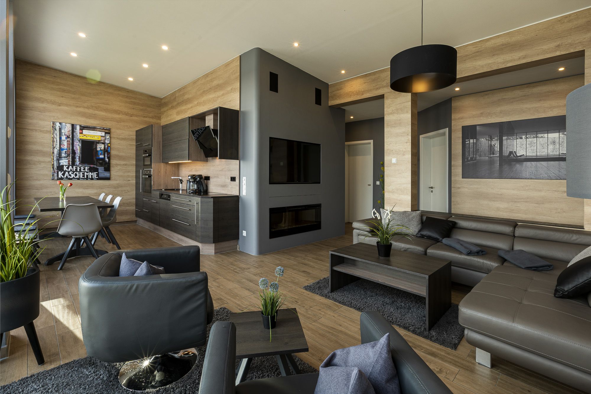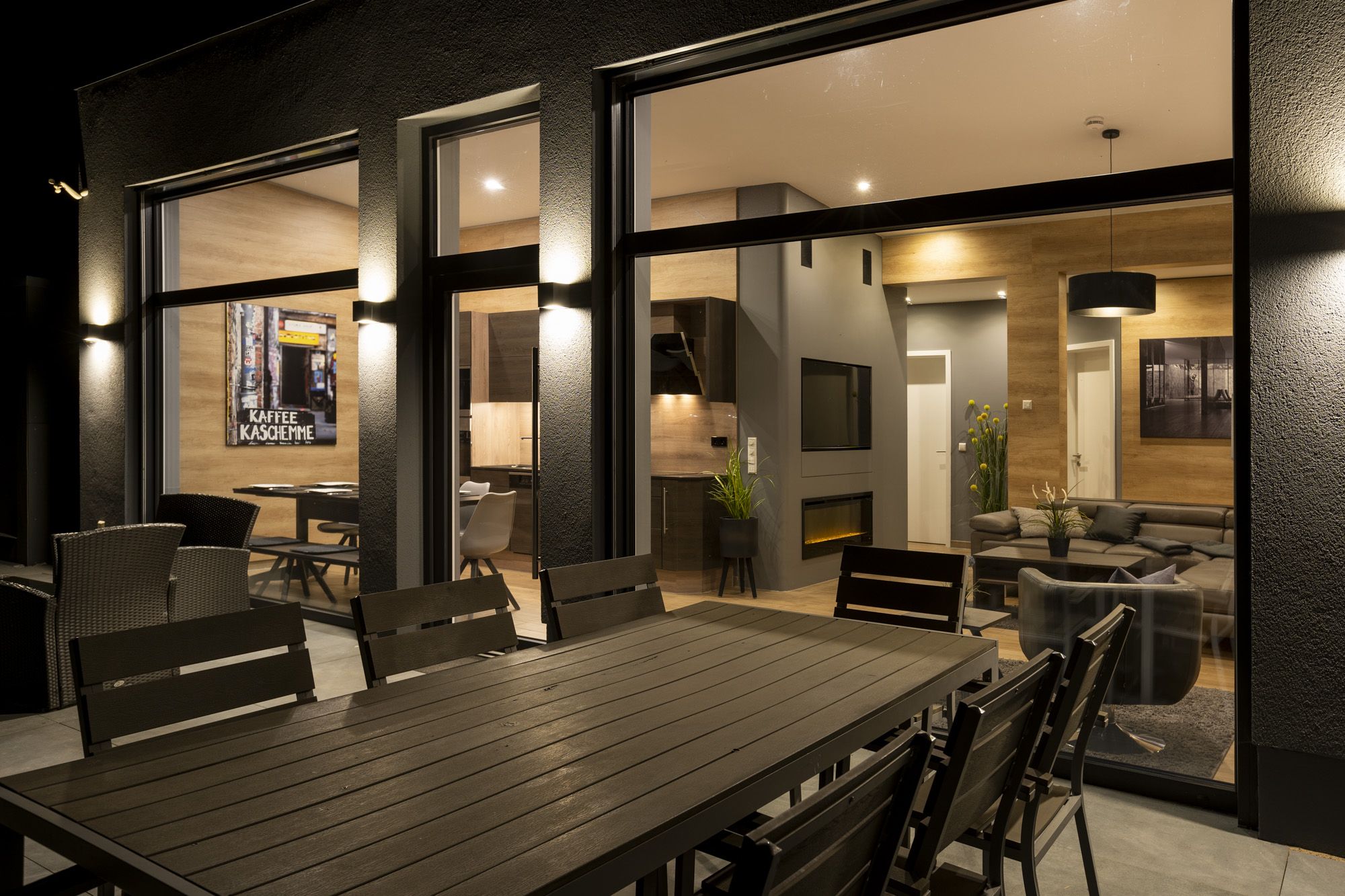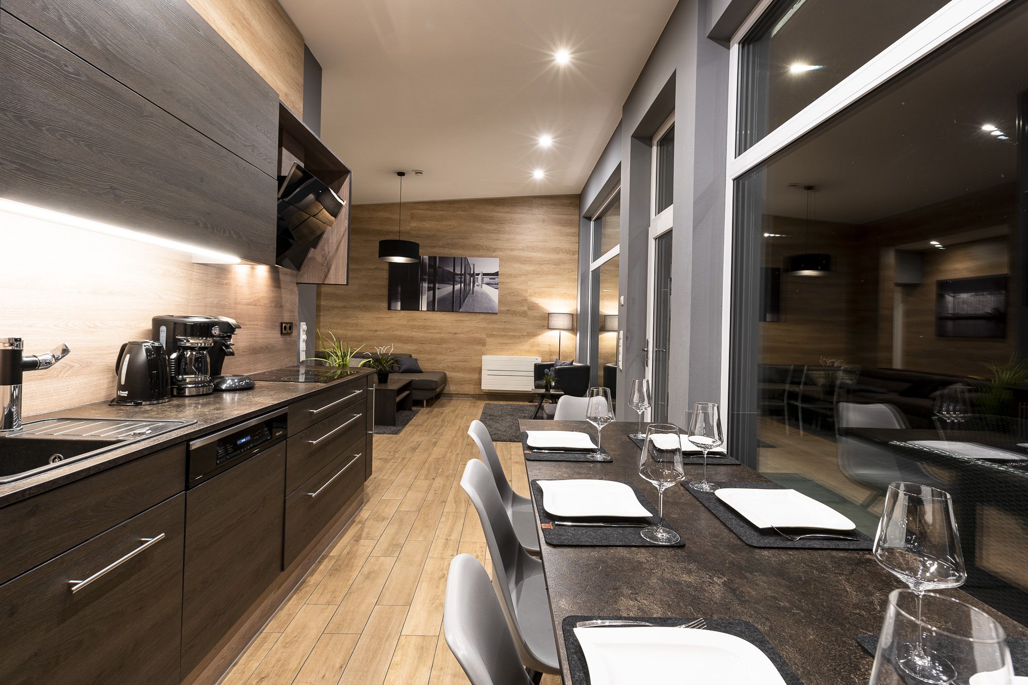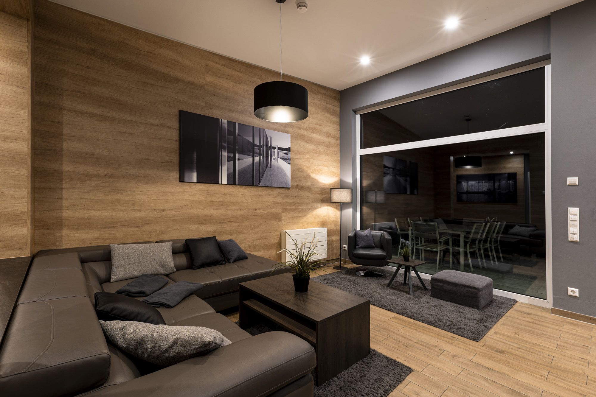 Neben der hochwertigen Ausstattung (Klimaanlage, Fußbodenheizung, Elektrokamin, Einbauküche mit modernen Geräten) erwarten Sie im barrierefreien Haus SUNSET eine harmonisch aufeinander abgestimmte Inneneinrichtung in Kombination mit einem beeindruckenden Lichtkonzept, einer gemütlichen Atmosphäre und einem dezenten Hauch von Luxus.