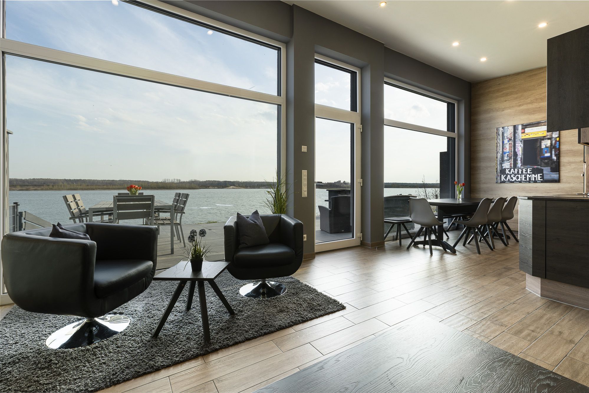 Der helllichte, sehr geräumige und stilvoll eingerichtete Raum mit offener, hervorragend ausgestatteter Küche mit großem Essplatz und bequemer Sitzecke ist Herzstück und Seele unseres Traumferienhauses SUNSET. Durch die riesige Panoramafensterfront nach Süden verschmilzt er fast mit der angrenzenden weitläufigen Sonnenterrasse zu einem einzigen imposanten Lichtraum. Von hier blickt man über den Garten zum privaten Sandstrand und den glasklaren Mühlfeldsee mit eigenem Strandzugang.