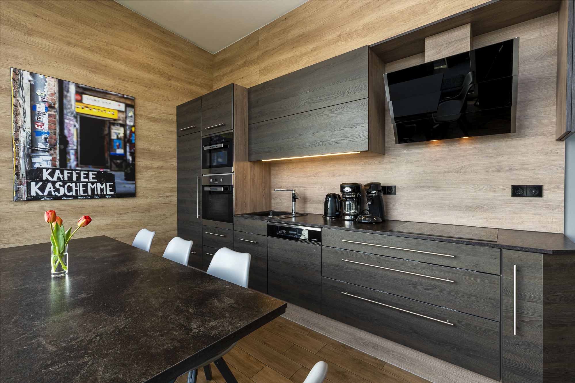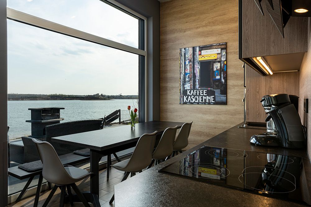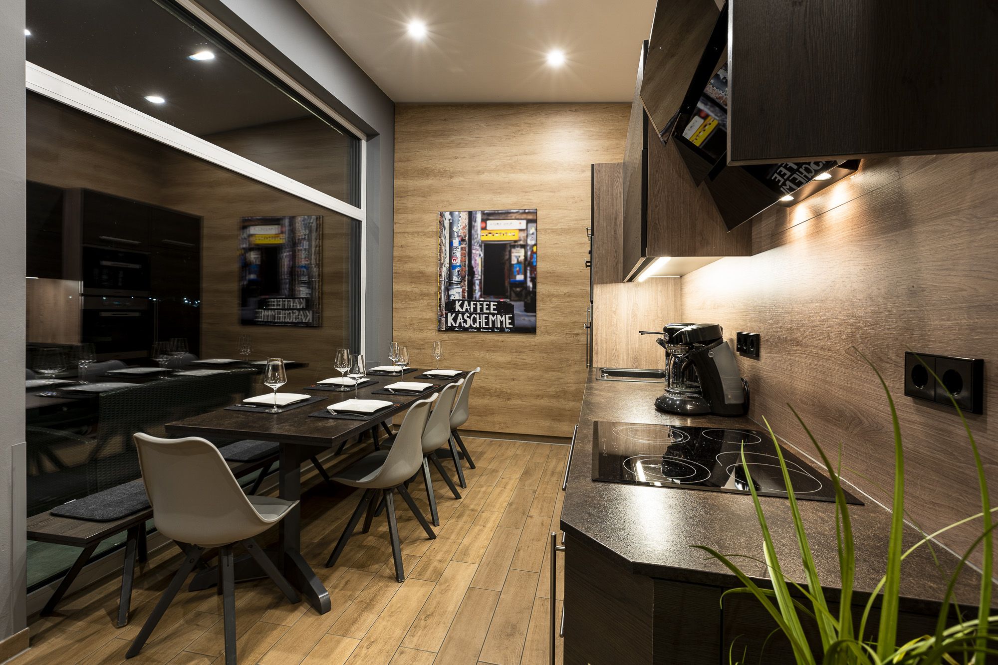 zum Wohnbereich offene Küche mit Essbereich und Fensterfront, Esstisch mit Sitzbank und Stühlen (Sitzmöglichkeiten für sieben Personen), Küchenzeile, Backofen, Induktionskochfeld, Kühlschrank, Gefrierschrank, Geschirrspüler, hochwertige und umfangreiche neue Küchenausstattung (Geschirr, Besteck, Töpfe + Pfannen, Geschirrhandtücher, Kaffeemaschine (Filtermaschine + Senseo Automat), Mikrowelle, Toaster, Wasserkocher, Küchenmaschine