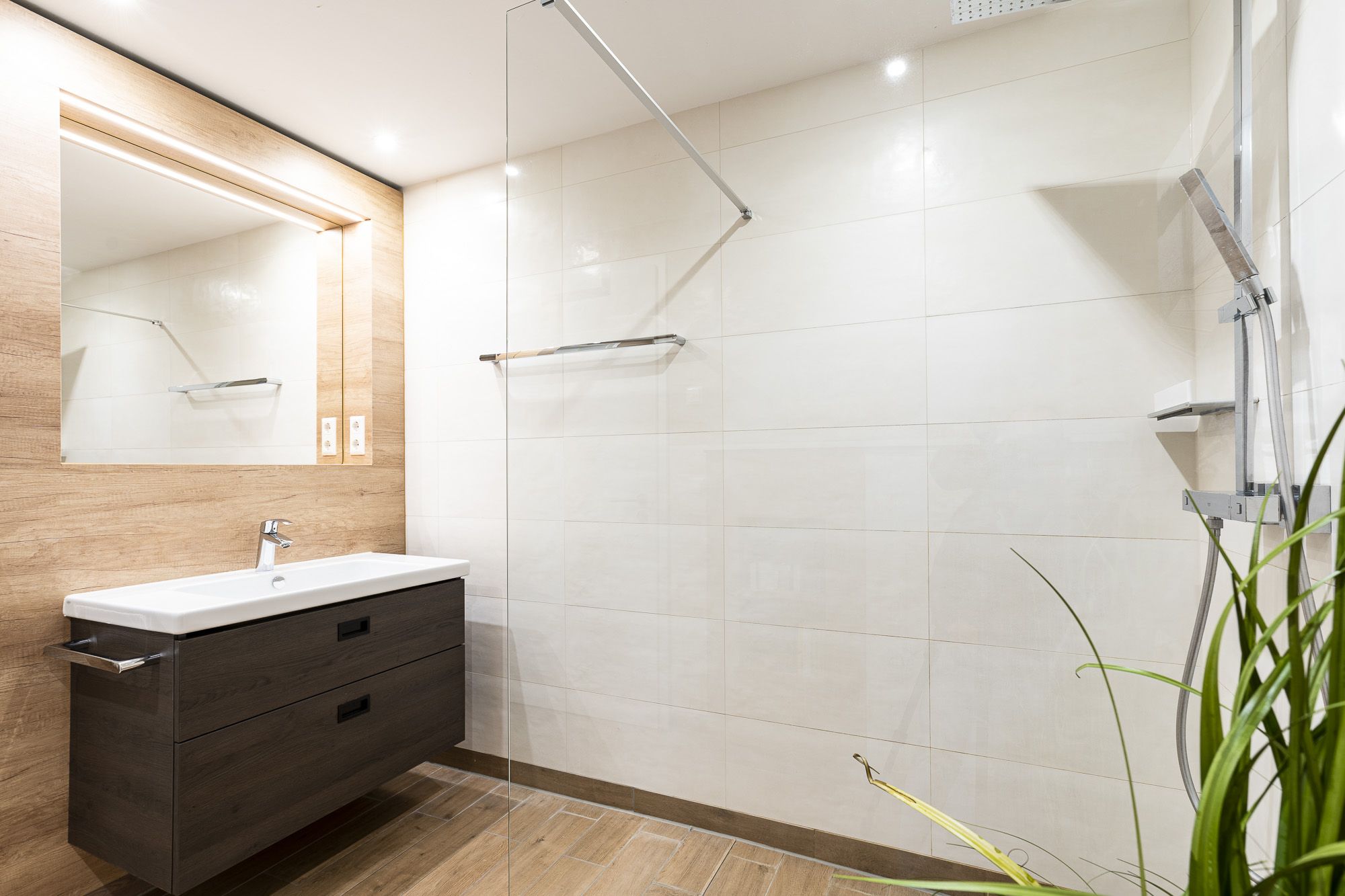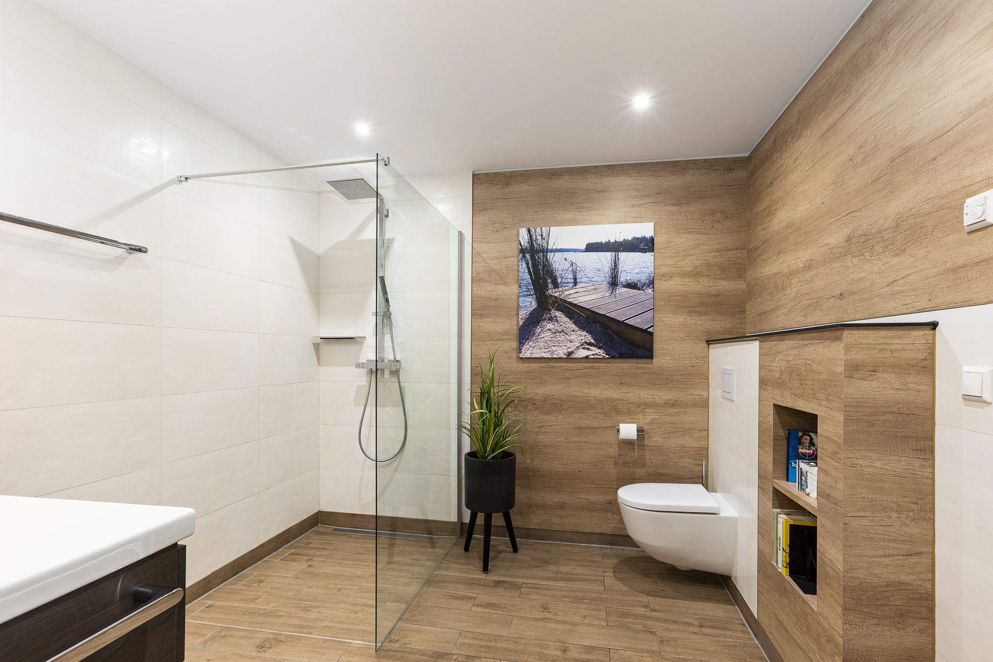 Waschtisch, WC, Dusche (bodengleich), Spiegel, Fön, Bücher