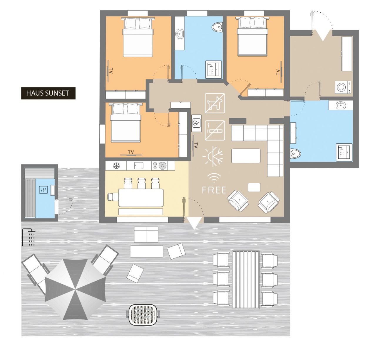 Das Haus SUNSET verfügt über drei Schlafzimmer mit Doppelbetten, zwei vollausgestattete Bäder mit Dusche, einen offenen Wohn- und Küchenbereich mit großzügigem Essbereich, insgesamt vier Fernseher, eine hauseigene Sauna, eine Sonnenterrasse mit Grill, Loungemöbeln, Liegen und Essbereich, Sonnenschirme, einen Privatstrand mit eigenem Seezugang und einem Wirtschaftraum mit Waschmaschine. Direkt vorm Haus stehen drei kostenlose Pkw-Stellplätze zur Verfügung. Für Hobbykapitäne liegt ein eigenes Boot am See vor Anker.