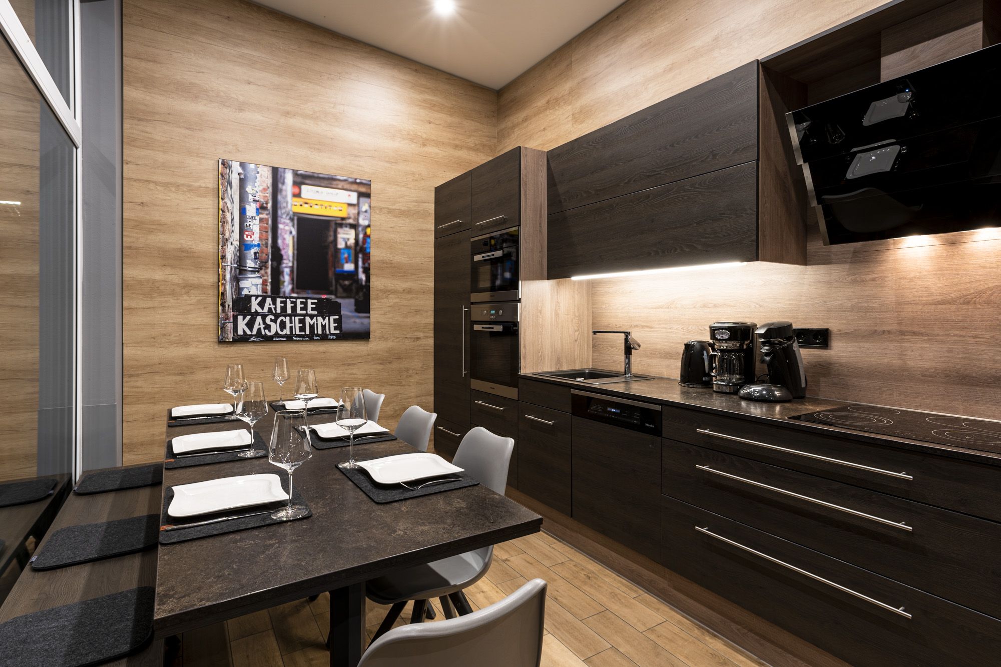 zum Wohnbereich offene Küche mit Essbereich und Fensterfront, Esstisch mit Sitzbank und Stühlen (Sitzmöglichkeiten für sieben Personen), Küchenzeile, Backofen, Induktionskochfeld, Kühlschrank, Gefrierschrank, Geschirrspüler, hochwertige und umfangreiche neue Küchenausstattung (Geschirr, Besteck, Töpfe + Pfannen, Geschirrhandtücher, Kaffeemaschine (Filtermaschine + Senseo Automat), Mikrowelle, Toaster, Wasserkocher, Küchenmaschine
