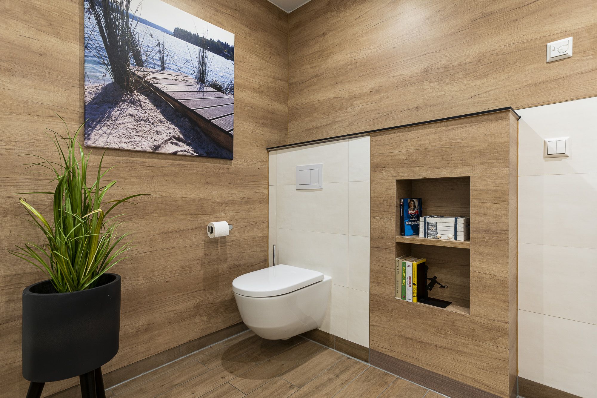 Waschtisch, WC, Dusche (bodengleich), Spiegel, Fön, Bücher